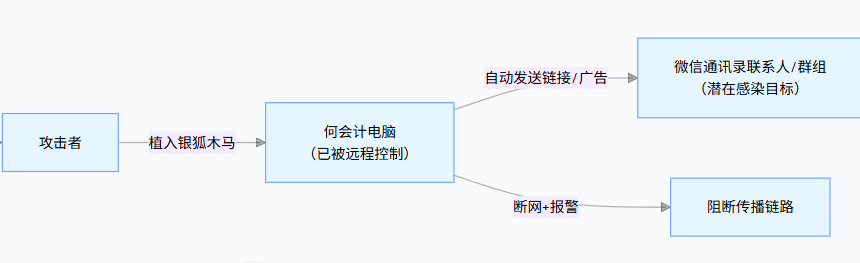 西南某省公司的李某在电脑上登录个人微信后,看到一份名为《补贴发放通知》的文件,习惯性的点开,几分钟后,发现自己的PC不受控制,鼠标光标在屏幕上自行移动,利用他的微信自动向通讯录中的联系人和群组发送广告信息与不明链接。李某迅速意识到电脑被入侵了,立即断网并告知了相关信息安全部门。后经确认,其电脑感染了“银狐”木马。攻击者已远程控制其电脑,并正利用其账号作为“跳板”,试图将病毒传播给更多人。所幸发现及时,避免了更大损失。